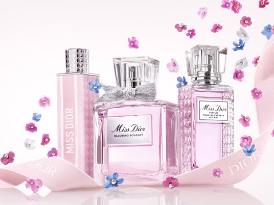 (左から)ミス ディオール ブルーミング ブーケ ミニ ミス ¥7,810(税込)/ ミス ディオール ブルーミング ブーケ 50mL ¥14,520(30mL ¥9,240 / 100mL ¥20,350)(税込) / ミス ディオール ヘアミスト 30mL ¥6,600(税込)