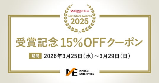 株式会社マーケットエンタープライズ(東京都中央区、代表取締役社長:小林 泰士、東証スタンダード・証券コード3135、以下「マーケットエンタープライズ」)は、「Yahoo!オークションBest Store Awards 2025」(主催:LINEヤフー株式会社)において、約21,000ストアの中から総合賞第1位に選出されました。昨年度に続く2年連続の快挙達成を記念し、2026年3月25日(水)から3月29日(日)までの5日間、当社ストア内の商品が15%OFFになる「受賞ストア限定クーポン」が配布されます。