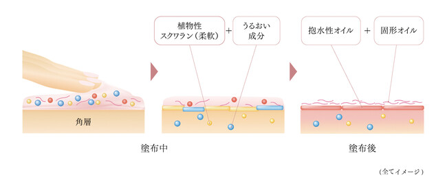 ハンドクリームの塗り心地のよさと、乾燥などの外的ストレスからしっかり守ってくれるやわらかなヴェール感。その秘密は、しっとり感を与えながらもさらりとしたテクスチャーです。手肌に塗布しなじませると、植物性スクワラン(柔軟)やうるおい成分が角層に届き、その後、抱水性の高いオイルと、さらりとしたテクスチャーの固形オイルが肌表面をコーティングするように働きます。このオイルの絶妙なバランスから、うるおいが続きながらもさらっとしたシルクのような感触を叶えています。