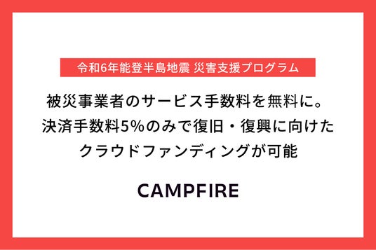 株式会社CAMPFIRE(本社:東京都渋谷区 / 代表取締役:家入 一真 )は、2024年の元日に石川県能登地方で発生した令和6年能登半島地震で被災されたプロジェクトオーナーを対象に、被災事業者が決済手数料5%のみでクラウドファンディングで復旧・復興のための支援を募ることができる「令和6年能登半島地震 災害支援プログラム」対象者の募集を開始します。