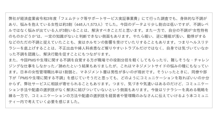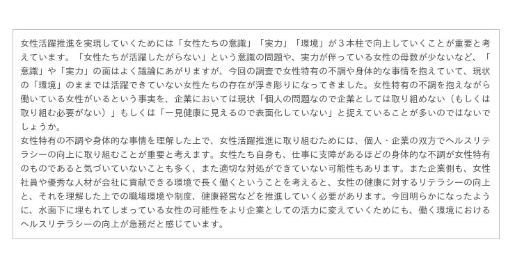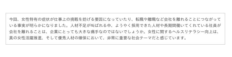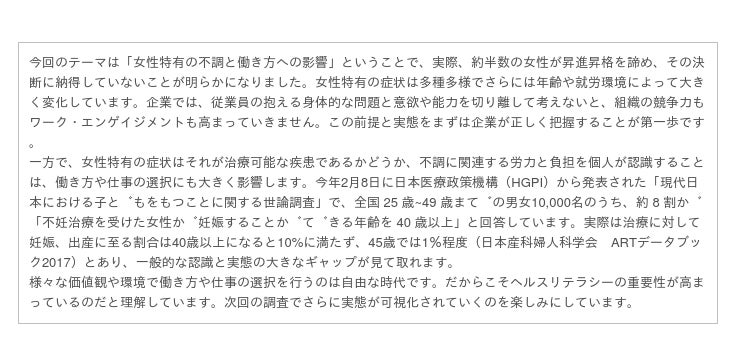 これまで女性特有の症状によってもたらされる様々な困難は「個人の問題」とされ、会社からの支援が必要だといった認知は十分に進んできませんでした。産婦人科医の高尾美穂氏をはじめとする本コミュニティの有識者は、女性自身がヘルスリテラシーを向上させることに加え、会社の適切な環境整備によって、働く女性がより生き生きと仕事に取り組むことができると述べています。