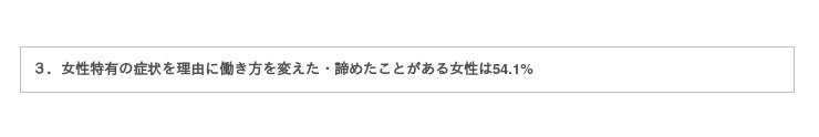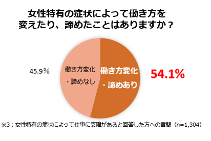 女性特有の症状によって仕事に支障があると回答した人に、「働き方を変えたり、諦めたりしたことはあるか」を聞いたところ、54.1%の女性が該当することが明らかになりました。(【グラフ3.※3】)