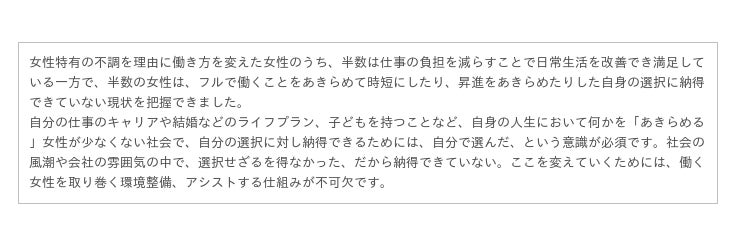 PMSや生理に関する症状で働き方を変えた人に対し、その選択に対する納得度を確認したところ、時短勤務に変更した女性のうち42.0%、昇進昇格を諦めた・断った女性のうち48.5%が「納得していない」と回答しました。(【グラフ6.※6】)PMSや生理に関する症状によって“やむを得ず”働き方を変更したがゆえ、納得できなかったという女性の心理が浮き彫りになりました。