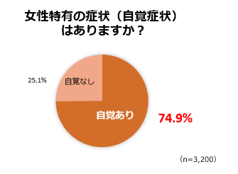 女性全体のうち、何らかの女性特有の症状を自覚している人は74.9%でした。(【グラフ1.】)