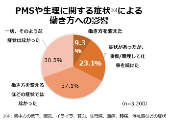 女性特有の症状の中でも、PMSや生理に関する症状によって「働き方を変えた」と回答した人は9.3%、「症状があったが、我慢/無理して仕事を続けていた」と答えた人が23.1%いることが分かりました。(【グラフ4.】)