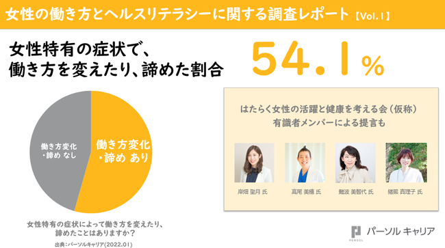 転職サービス「doda」などを提供するパーソルキャリア株式会社(本社:東京都千代田区、代表取締役社長:峯尾 太郎、以下パーソルキャリア)は、女性の働き方とヘルスリテラシーに関する調査を実施し、第1弾の結果をまとめましたので、お知らせいたします。第1弾では、女性特有の症状を理由に働き方を変えたり、諦めた経験の有無および納得度を明らかにします。なお本調査は、パーソルキャリアがキャリアオーナーシップ推進支援を行うにあたり、はたらく女性が直面している実態と課題を理解するために実施し、コミュニティ「はたらく女性の活躍と健康を考える会(仮称)」有識者の方々(岸畑 聖月氏、高尾 美穂氏、難波 美智代氏)、コミュニティファシリテーター猪熊 真理子氏から、調査結果をもとにした課題提起をしていただいています。