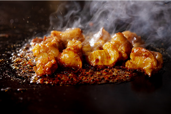 お代わり&リピートする大人気の鉄板焼き。高品質な国産のホルモンと青森県産のにんにくと、特製のヤンニョムダレで仕上げる鉄板料理で一番人気のホルモン。