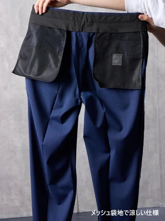 ・メッシュ裏地 :ポケット袋と膝当てにメッシュ素材を使用し、べたつきにくい肌触り