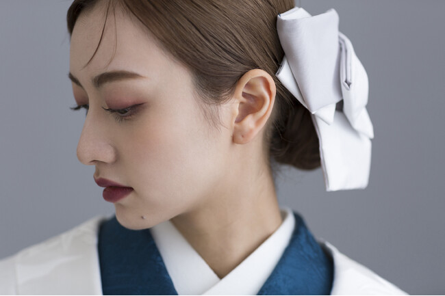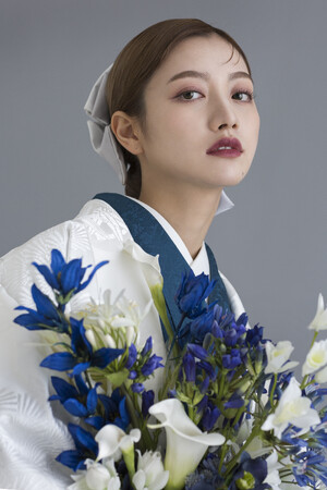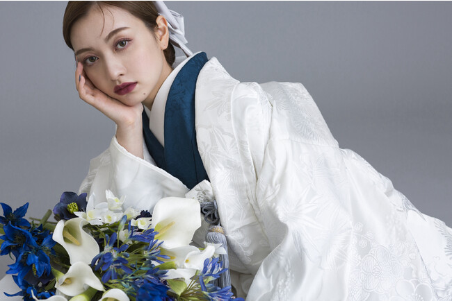 今回は洗練された松竹梅の白無垢にオリジナルで作成した”藍花”の掛下を合わせ、コントラストを効かせた斬新なスタイリングに仕上げました。それに合わせ背景はとことんシンプルに。絶妙なバランスが品を引き立て、全てが映えて高貴な印象になります。