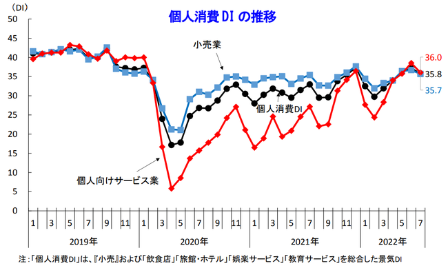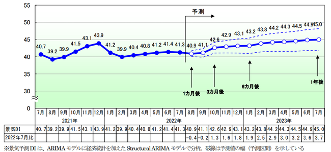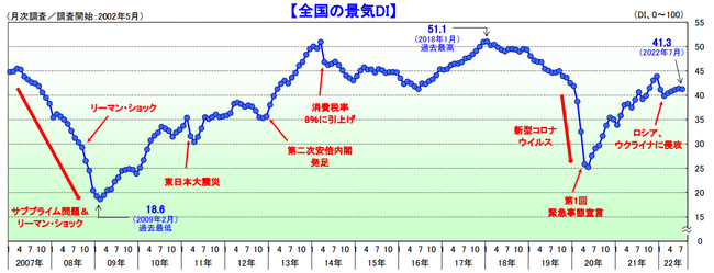 2022年7月の景気DIは前月比0.1ポイント減の41.3となり、5カ月ぶりに悪化した。