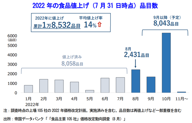 食品主要105社において7月末時点で8,058目が値上げ、8月以降も1万品超の値上げが予定され、年内で2万品目を突破する見込み。