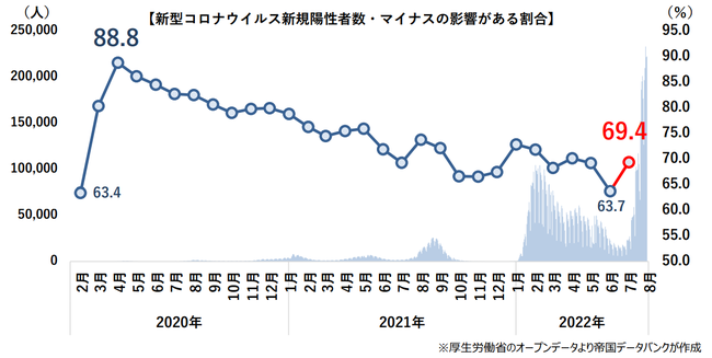 新型コロナウイルス感染症により、業績へ「マイナスの影響がある」とした企業は69.4%(前月比5.7ポイント増)となり3カ月ぶりに上昇。