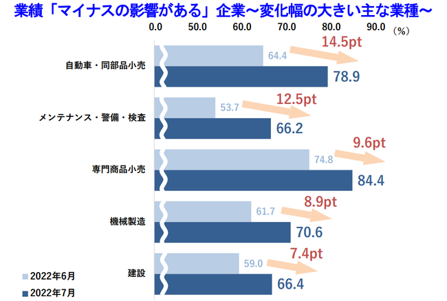 業種別では、「自動車・同部品小売」(同14.5ポイント増)や「メンテナンス・警備・検査」(同12.5ポイント増)、「機械製造」(同8.9ポイント増)などで前月より大幅に上昇がみられた。
