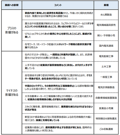 一部でプラスがみられるも、第7波による感染者や濃厚接触者の急増を受け、人手不足による生産の停滞など業務に支障を来している。