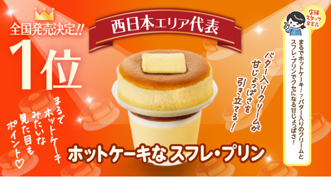 第2位は中日本エリアの「りんごのスフレ・プリン~焼きりんご入り~」、第3位は北日本エリアの「チョコバナナスフレ・プリン~チョコクッキー入り~」、第4位は東日本エリアの「レモンチーズのスフレ・プリン」、第5位は沖縄エリアの「紅芋とチョコのスフレ・プリン~ホワイトソースを添えて~」、そして第6位は南九州エリアの「塩コクっとうスフレ・プリン」という結果になりました。