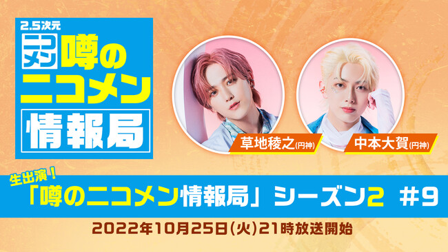 毎回旬なゲストを迎えて放送中の本番組で、第9回目ゲストとしてオーディション番組『PRODUCE 101 JAPAN』(TBS)から誕生し、2020年にデビューした9人組ダンスボーカル&パフォーマンスグループ、円神から昨今は俳優としても活躍中の草地稜之と中本大賀がニコ生に出演決定。