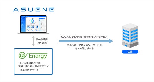 両社は、CO2排出量見える化・削減・報告クラウドサービス「ASUENE」とのデータ連携を通じて、電力使用量を起点としたCO2排出量の見える化から、省エネ法や自治体条例への対応まで、脱炭素経営に不可欠な業務の効率化と正確性向上が実現します。
