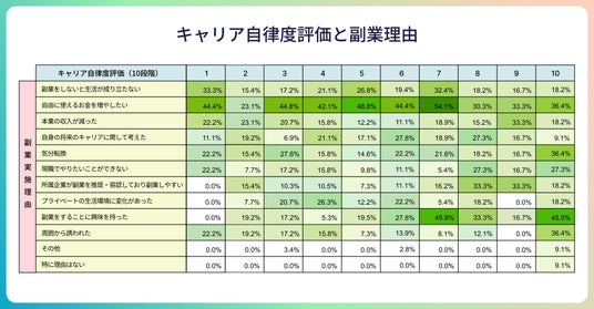 また、キャリア自律度別に副業実施理由を見ると、1~7と回答した人では「自由に使えるお金を増やしたい」が最多の副業実施理由となっており、一方8~10と回答した人は「副業をすることに興味を持った」「所属企業が副業を推奨・容認しており副業しやすい」などを理由として多く挙げていました。キャリア自律度が高い人においては、個人の意識だけでなく、副業に対する企業の環境整備も、副業実施に影響していることが伺えます。