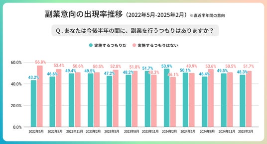 また、今後の副業意向の推移では、「実施するつもりだ」の回答者率についても前回調査の49.5%から48.3%と微減しています。