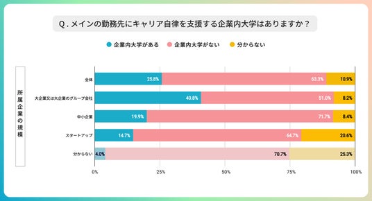 また、企業規模別で見ると、「企業内大学がある」と回答した人は、大企業では40.8%、「中小企業」では19.9%、「スタートアップ」では14.7%といった結果になりました。人的資本経営が注目される中、大企業が先行して、キャリア形成や次世代リーダーの育成などを目的に設立していることが伺えます。