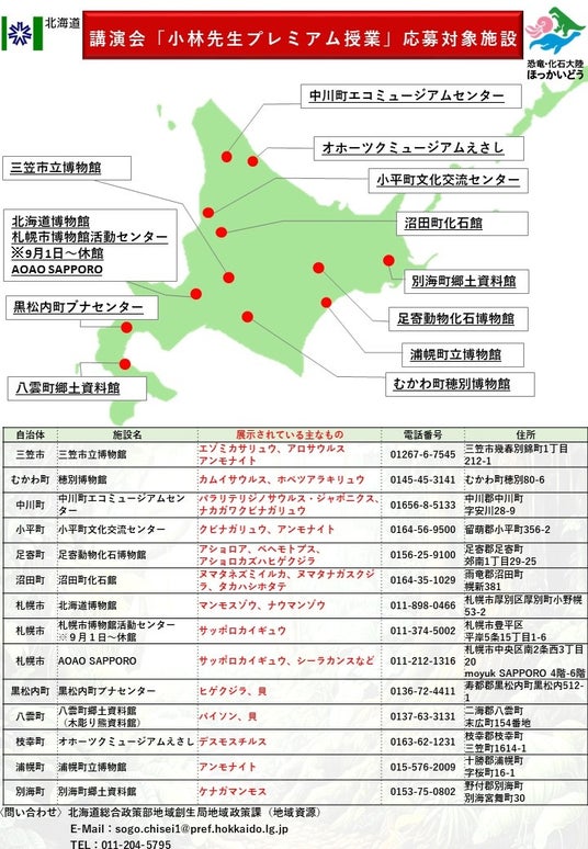 北海道では、恐竜をはじめアンモナイトやクビナガリュウなど様々な古生物の化石が発見されています。多くの方々に各地域の展示施設を訪れていただき、道内の恐竜や古生物の魅力を知っていただくため、道内展示施設の来館者を対象として、我が国の恐竜研究の第一人者である北海道大学 小林快次教授の講演会「プレミアム授業」に無料でご招待します。