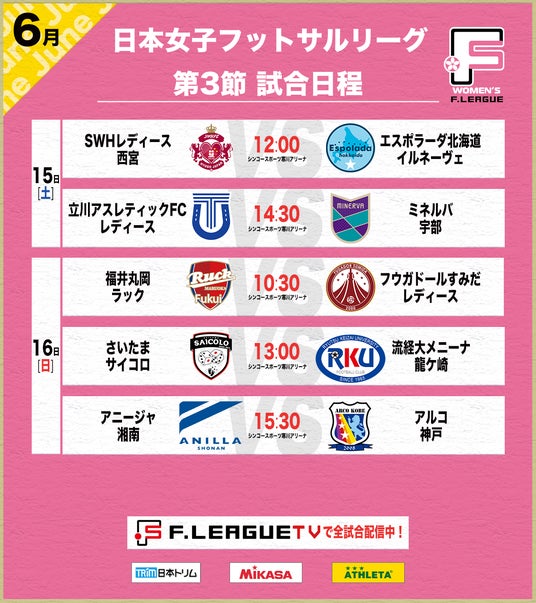 6月15日(土)、16日(日)にシンコースポーツ寒川アリーナ(神奈川県高座郡寒川町)にて、日本女子フットサルリーグ(女子Fリーグ)の第3節が開催されます。