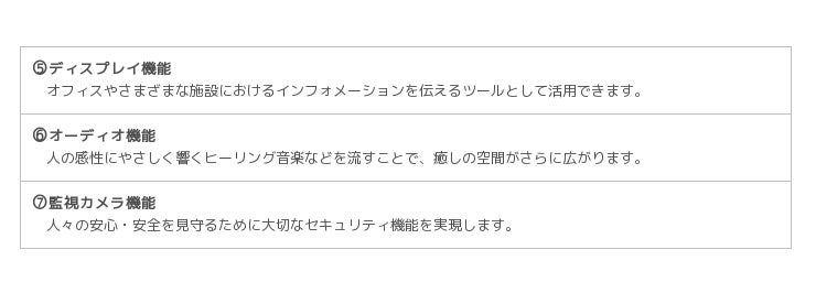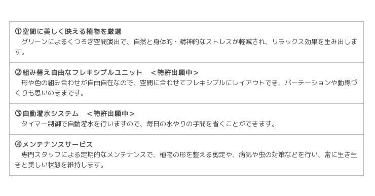 ユニットを自由に組み合わせることで、あらゆる空間にフィットするインテリア性の高さ、人が心地よく過ごせて会話がはずむ快適な空間づくり、そして日々のメンテナンスの手軽さを可能にする商品です。オフィス空間や店舗スペースに設置し、パーテーションなどにも利用できます。