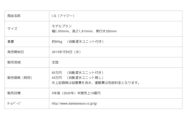 大和ハウスグループの大和リース株式会社(本社:大阪市、社長:森田俊作)は、屋上緑化事業や壁面緑化事業にて培われたノウハウを活かし、室内緑化システム新商品「i.G(アイジー)」を開発。7月8日(水)より受注、販売を開始します。