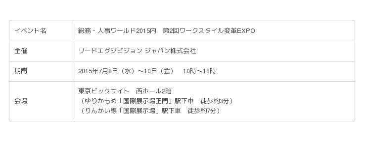 当社は2015年7月8日(水)~10日(金)まで開催される「総務・人事ワールド2015内 第2回ワークスタイル変革EXPO」に出展します。同展示会は生産性向上・営業力強化が求められる中で高い注目が集まる「ワークスタイル変革」に特化した商談専門展です。ブースには新商品「i.G(アイジー)」を展示します。ぜひご来場ください。