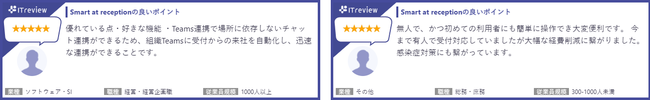 「ITreview Grid Award」とは、ITreviewに投稿されたレビューをもとに四半期に一度ユーザーに支持された製品を表彰する場です。今回は2022年12月までに集まったレビューをもとに評価ポイントが集計され、「Smart at reception」の顧客満足度が高かったことから「High Performer」が表彰されました。
