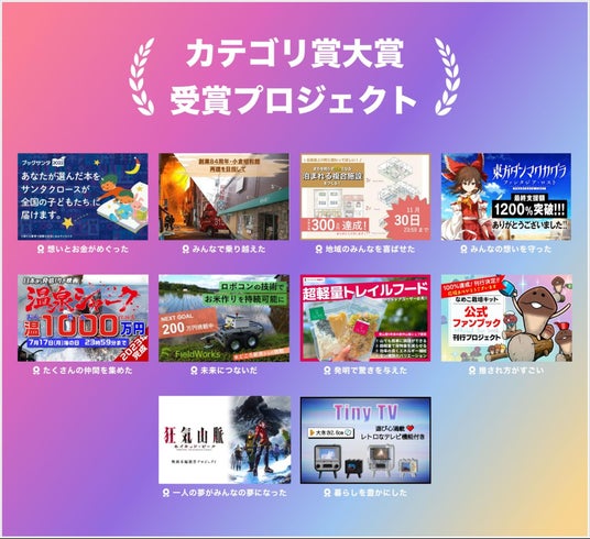 今回は、ノミネートされたプロジェクトからX(旧Twitter)を通じて募った14,000件以上の投票や、各プロジェクトの支援者数、世の中へ与えた影響などの観点から「総合賞」を含む10の表彰部門の受賞プロジェクトを決定しました。
