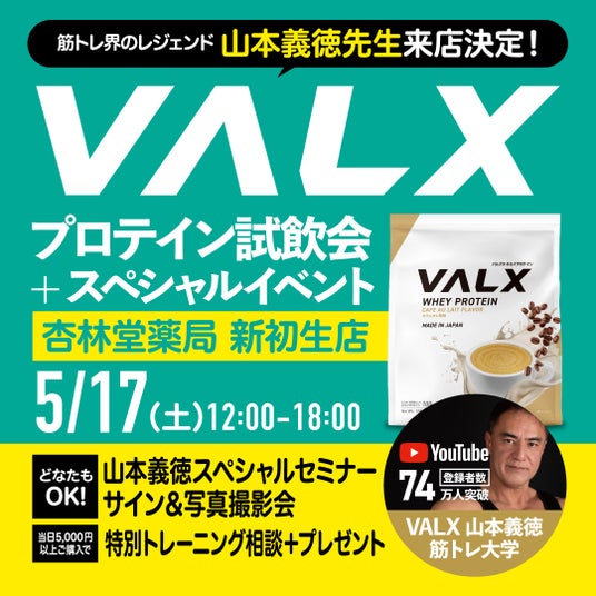 フィットネスブランド「VALX(バルクス)」を展開するVALX株式会社(本社:東京都渋谷区、代表取締役:只石昌幸、以下VALX)は、2025年5月17日(土)に静岡県にある杏林堂薬局 新初生店にて、筋トレ界のレジェンド「山本義徳氏」を招いたスペシャルイベントを開催いたしました。