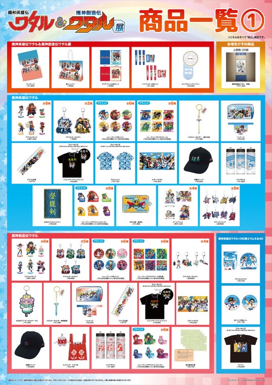 本展では、『魔神英雄伝ワタル 七魂の龍神丸』のキャラクターデザイン・牧内ももこさん、『魔神創造伝ワタル』のキャラクターデザイン・中野繭子さん、湯本佳典さんによる描き下ろしイラストを使用した商品を中心に、「龍王の剣」、「神創龍剣」のメタルキーホルダーや、ハイマッキー2本セットなど、子供心をくすぐる商品を多数販売いたします。