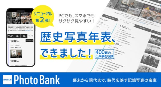 毎日新聞社(代表取締役社長:松木健)が運営する日本最大規模の法人向け写真データベース「毎日フォトバンク」に7月24日、歴史写真年表が登場しました。現存する日刊紙としては最も長い、150年以上の歴史を誇る毎日新聞社ならではの豊富な写真コンテンツについて、1850年代以降の時代を映す出来事をたどりながら探せるようになりました。