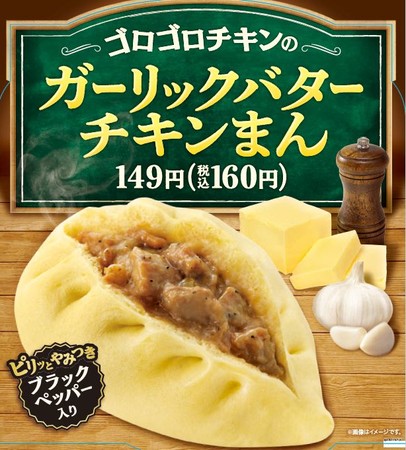 今回新発売する「ガーリックバターチキンまん」は、日本酒、みりん、塩等で一晩じっくり漬け込んで下味をつけた鶏肉や具材を、きざんでカットした香り高い生のにんにくとコクのあるバターを使ったガーリックバター味に仕上げ、ふんわりもっちりした中華まんの生地で手包みしました。具材の約半分を大きめにカットした鶏肉がしめており、食べたときに「ガーリックバターチキン」のゴロゴロとした食感を味わえるように仕立てました。