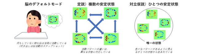 図. 脳のデフォルトモード。吹き出しは機能的MRIで計測した脳活動のスナップショット。定説では、デフォルトモードでは脳は複数の安定状態を遷移する。対立仮説では、見かけの異なる脳活動のパターンは、実際には一つの状態から生まれる。今回の研究では対立仮説の方が正しい可能性が示唆された