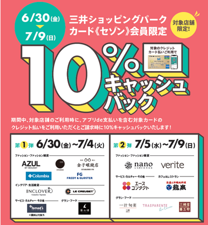 期間中、対象店舗にてアプリde支払いを含む対象カードのクレジット払いをご利用いただくと、ご請求時に10%キャッシュバックいたします。