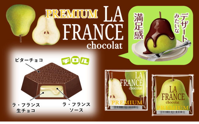 ラ・フランスの生チョコをビターチョコで包みました。ジューシーなソースがアクセントに。ラ・フランスの芳醇な香りと生チョコの濃厚な味わいがバランスよく味わえます。