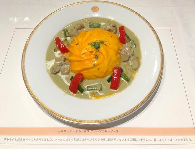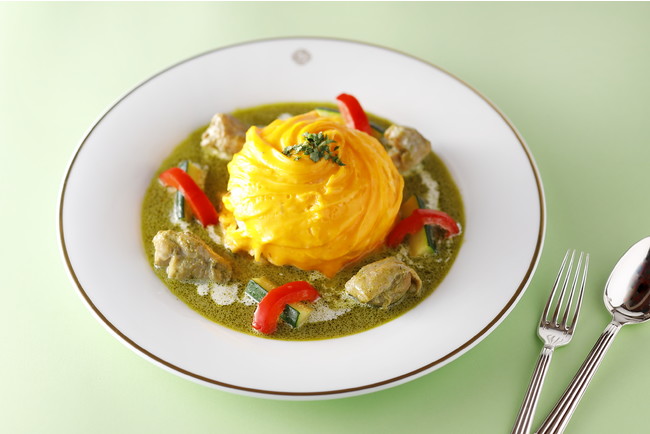 資生堂パーラーは、名古屋店にて2022年3月1日(火)から3月31日(木)までの期間、『ドレス・ド・オムライス グリーンカレーソース』を提供いたします。このメニューは、資生堂パーラーで2021年10月25日(月)に開催された社員のモチベーションとスキルの向上を図る“オムライス選手権2021”にて優秀賞を獲得した名古屋店の調理担当 安井健人さんが考案した作品です。今回初めて期間限定メニューとして新登場します。いつもの資生堂パーラー人気の定番オムライスとは趣の違う、美しいイエローのドレスをまとったオムライスとスパイスを効かせながらもマイルドに仕上げたグリーンカレーのコンビネーションを是非この機会に春の訪れを感じながらお楽しみください♪