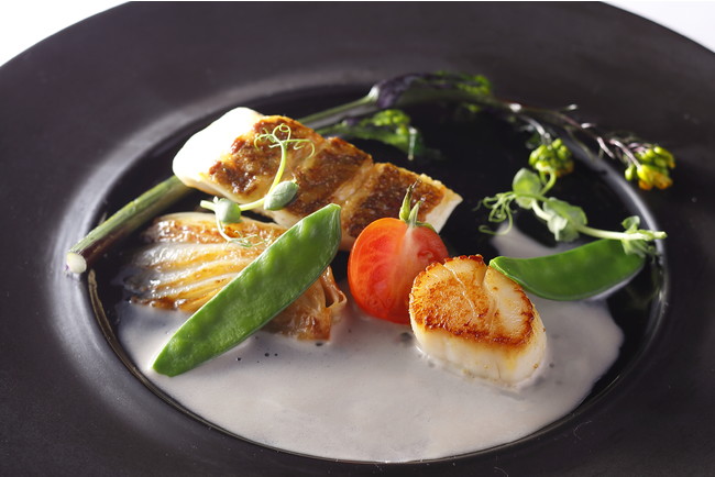 皮はパリッと身はふっくらと仕上げた真鯛に香ばしくジューシーに焼き上げた帆立貝を添えました。春らしく爽やかなロゼワインソースとお楽しみください。