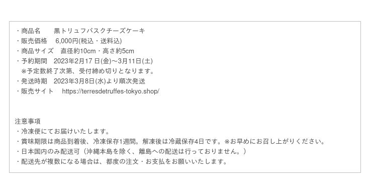 2023年2月17 日(金)~3月11日(土)、株式会社ワンダーテーブル[本社:東京都新宿区西新宿/代表取締役社長 秋元 巳智雄]が運営する、トリュフ料理専門店「テール・ド・トリュフ 東京」のオンラインショップでは、ホワイトデー企画として黒トリュフを使った贅沢な“黒トリュフバスクチーズケーキ”を販売します。