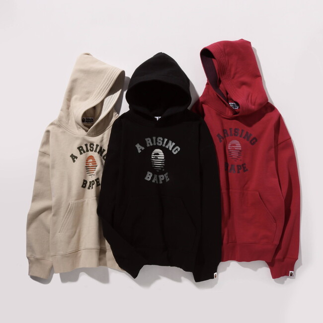 第1弾は「日の出」をモチーフにしたバイカラーのAPE HEADをカレッジロゴのグラフィックに落とし込み、Tシャツ、フーディ、スウェットパンツをラインアップしました。