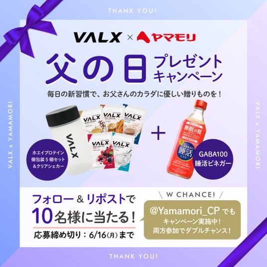 今回のキャンペーンでは、「内側からの健康づくり」をテーマに、VALXとヤマモリがそれぞれの強みを活かした「父の日限定健康ギフトセット」を抽選でプレゼントします。