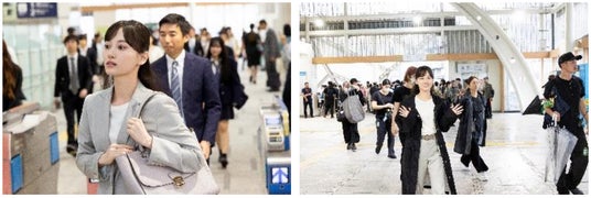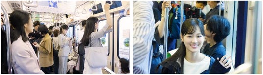 グレーのスーツを身に纏った山下美月さんは、満員電車に揺られながら撮影に挑みました。外を眺めて笑顔を見せる場面も。カメラに気づくと、手を振ってくれました。