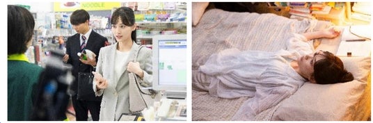 続くコンビニシーンの撮影も難なくこなし、いよいよ夜の自宅撮影に。ゆるいお団子にパジャマ姿の山下美月さん。寝転びながら日記を書いて、眠りに落ちるシーンを演じました。会社のシーンでは、リモート打ち合わせを行ったり、ランチタイムを楽しんだり、会社員を楽しんでいる様子も伺えました。
