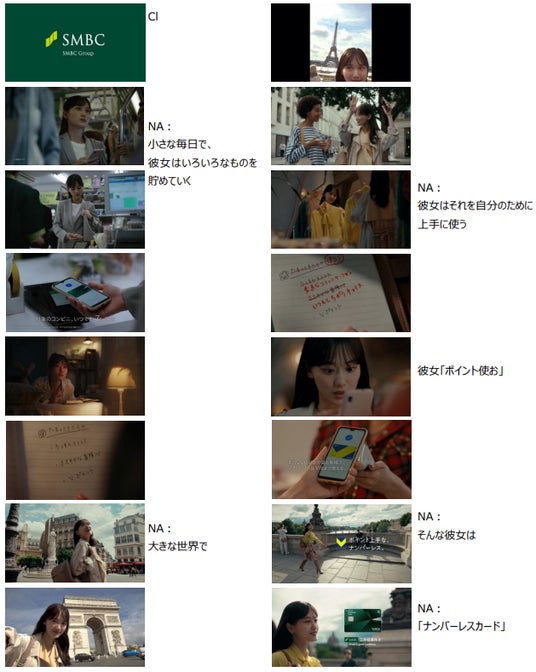 三井住友カードの新イメージキャラクターとして登場したのはグレーのスーツを身にまとった会社員役の山下美月さん。朝はいつもの通勤風景、ランチはコンビニ、午後はリモート打ち合わせ。日常生活を通じて日々の小さなストレスがたまっていく中、ある日、会社の先輩に「旅に出ます」と宣言をします。山下美月さんはパリ旅行に飛び出し、大きなジェスチャーで道を尋ねたり、今までためたVポイントでいつもより派手な服を買ってみたりと、ナンバーレスカードで少し自由になった女性の姿を描いています。