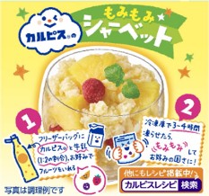 パッケージは、「カルピス」の水玉模様を背景に中央に2つのパイン素材をあしらい、ボトル全体を濃淡のある黄色にすることでパインの豊かな味わいを表現しています。また裏面には「カルピス」と牛乳、お好みの果物をフリーザーバックに入れて凍らせて作る「もみもみシャーベット」のレシピを掲載し、親子で楽しめるシーンを提案しています。
