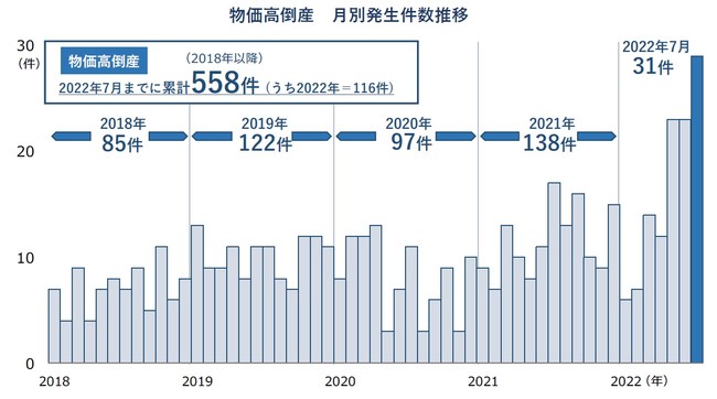 原油や燃料、原材料などの「仕入れ価格上昇」、取引先からの値下げ圧力などで価格転嫁できなかった「値上げ難」などにより、収益が維持できずに倒産した「物価高倒産」が急増している。調査開始の2018年1月から、2022年7月までに判明した「物価高倒産」は累計558件。2022年は1~7月で116件に達し、過去5年で最多となった2021年(138件)を大幅に上回るペース。7月は単月で最多の31件判明し、前年同月(17件)を82.4%上回るなど、早ければ8月にも年間最多件数を更新する可能性が高い。