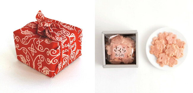 まめぐいに包まれたお菓子は、新潟県産のもち米を使用した、えび味が香ばしい可愛らしい桜型のあられです。