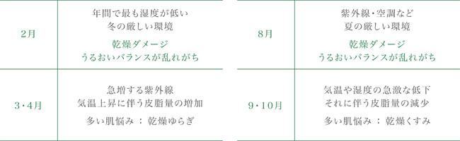 冬から春への春先と、夏から秋への秋口。季節の変わり目は気温や湿度の変化、紫外線量の増加などによる外部環境の変化によって、肌のうるおいバランスが乱れがちになります。美しく次の季節を迎えるために、“先回りのうるおい集中ケア”で、肌をすこやかに保つことをおすすめしています。